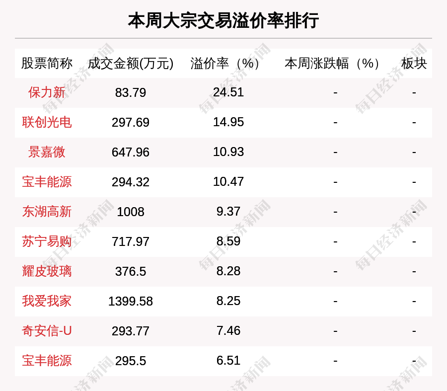 溢价交易方面,本周有4笔大宗交易溢价率超过10%。