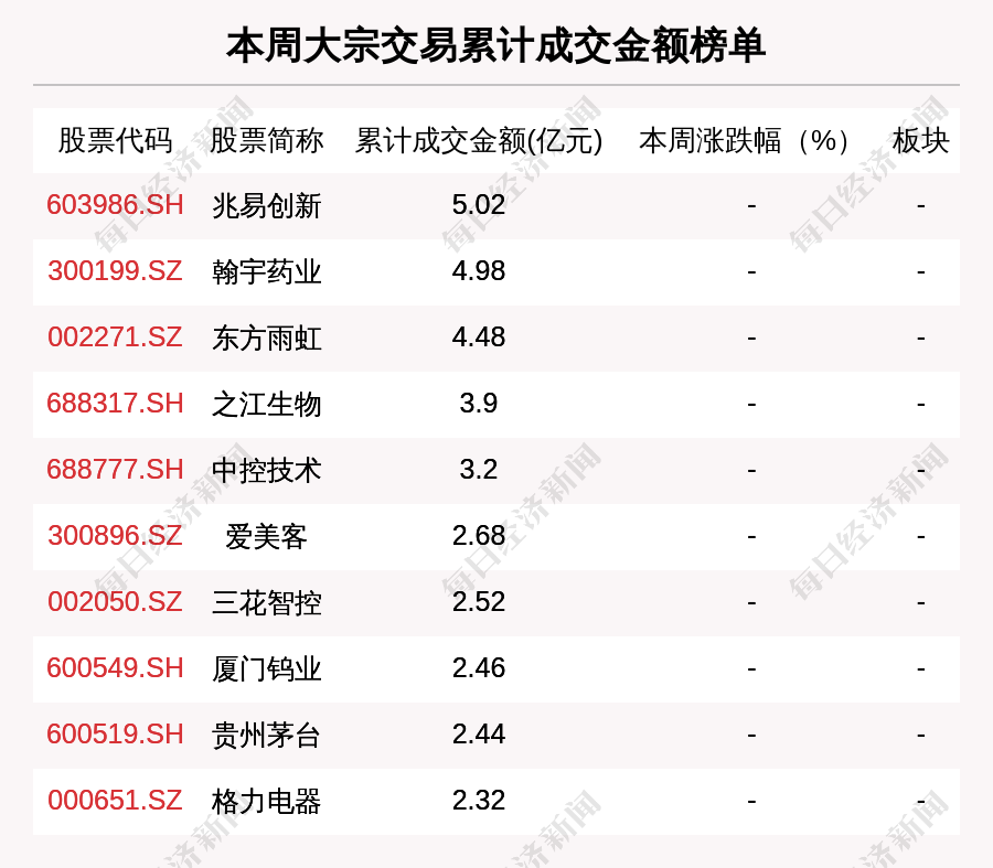 本周大宗交易累计成交金额前3的公司是兆易创新、翰宇药业、东方雨虹,累计成交金额分别为5.02亿元,4.98亿元,4.48亿元。