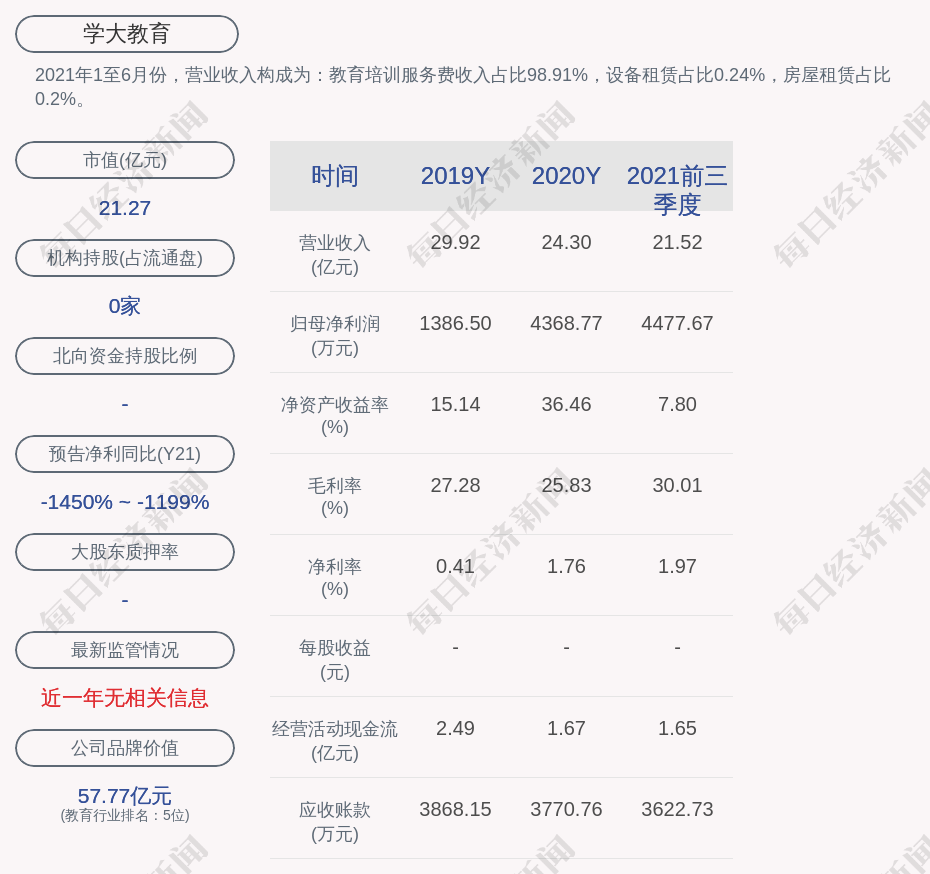 2021年1至6月份,学大教育的营业收入构成为:教育培训服务费收入占比98.91%,设备租赁占比0.24%,房屋租赁占比0.2%。
