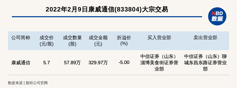 每经讯,2022年2月9日,新三板基础层公司康威通信(833804)发生一笔大宗交易,成交价5.7元/股,成交数量57.89万股,成交金额329.97万元,折价5%。买入营业部是中信证券(山东)淄博美食街证券营业部,卖出营业部是中信证券(山东)聊城东昌东路证券营业部。