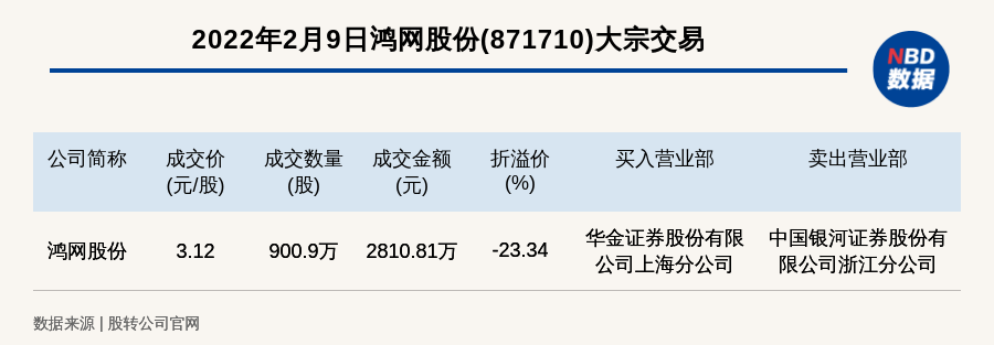 每经讯,2022年2月9日,新三板创新层公司鸿网股份(871710)发生一笔大宗交易,成交价3.12元/股,成交数量900.9万股,成交金额2810.81万元,折价23.34%。买入营业部是华金证券股份有限公司上海分公司,卖出营业部是中国银河证券股份有限公司浙江分公司。