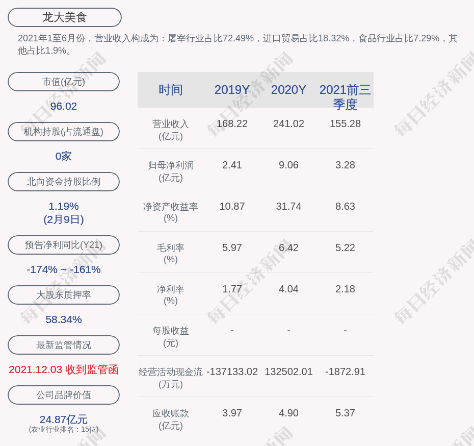 2021年1至6月份,龙大美食的营业收入构成为:屠宰行业占比72.49%,进口贸易占比18.32%,食品行业占比7.29%,其他占比1.9%。