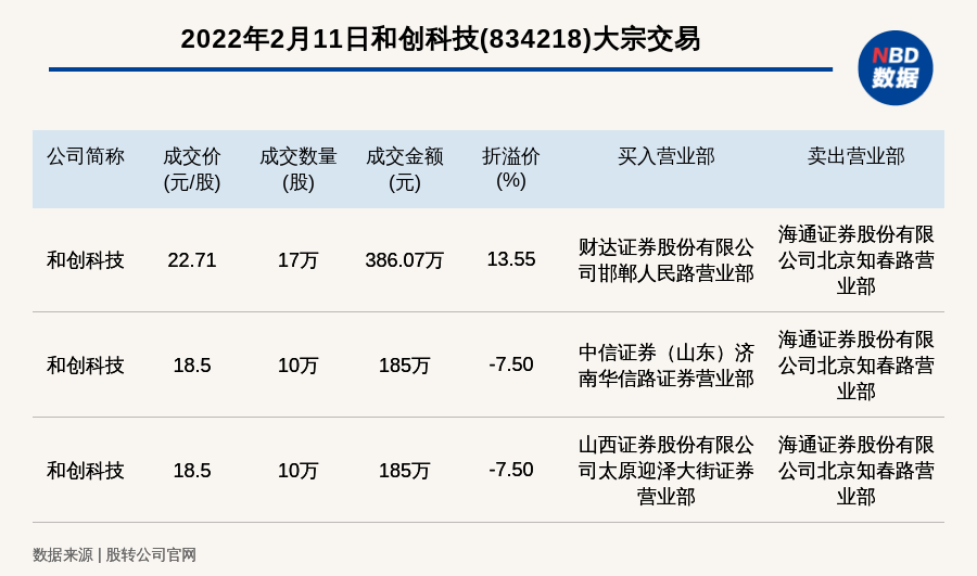 每经讯,2022年2月11日,新三板创新层公司和创科技(834218)发生3笔大宗交易,溢价率最高的一笔成交价22.71元/股,成交数量17万股,成交金额386.07万元,溢价13.55%。买入营业部是财达证券股份有限公司邯郸人民路营业部,卖出营业部是海通证券股份有限公司北京知春路营业部。