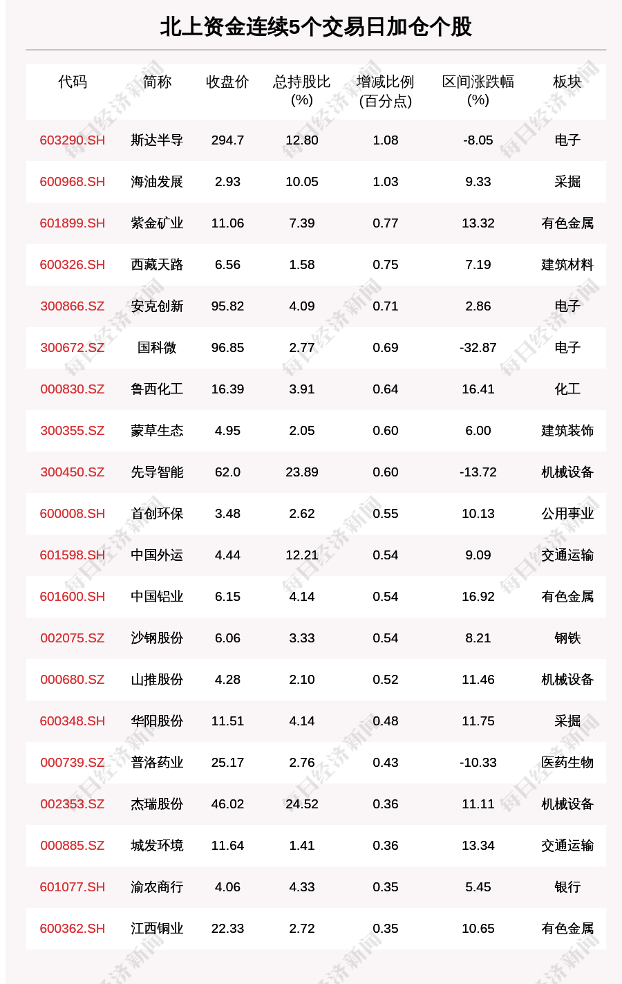每经AI快讯,2月11日,北上资金连续5个交易日买入83个股。北上资金连续5个交易日加仓个股中,斯达半导(603290.SH,收盘价:294.7元)增持比例增幅最大,5个交易日增持1.08个百分点,其他增持比例较大的个股包括海油发展(600968.SH,收盘价:2.93元)、紫金矿业(601899.SH,收盘价:11.06元)、西藏天路(600326.SH,收盘价:6.56元),分别增持1.03个百分点、0.77个百分点、0.75个百分点。