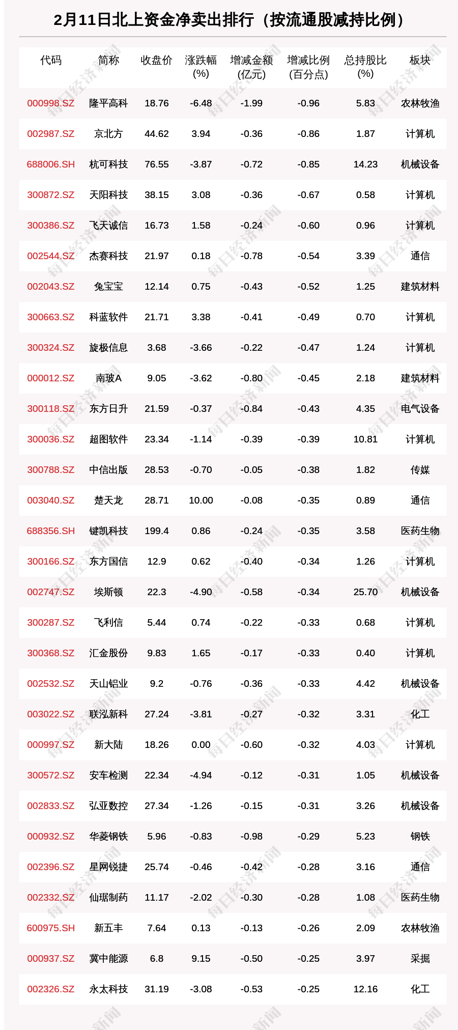 每经AI快讯,2月11日,北上资金净卖出的个股共有809只,北上资金减仓比例超1%的有653只。其中,隆平高科(000998.SZ,收盘价:18.76元)减仓比例最为明显,最新持股比例5.83%,环比减少0.96个百分点。其他北上资金减仓比例较多的个股还包括京北方(002987.SZ,收盘价:44.62元)、杭可科技(688006.SH,收盘价:76.55元)、天阳科技(300872.SZ,收盘价:38.15元)。