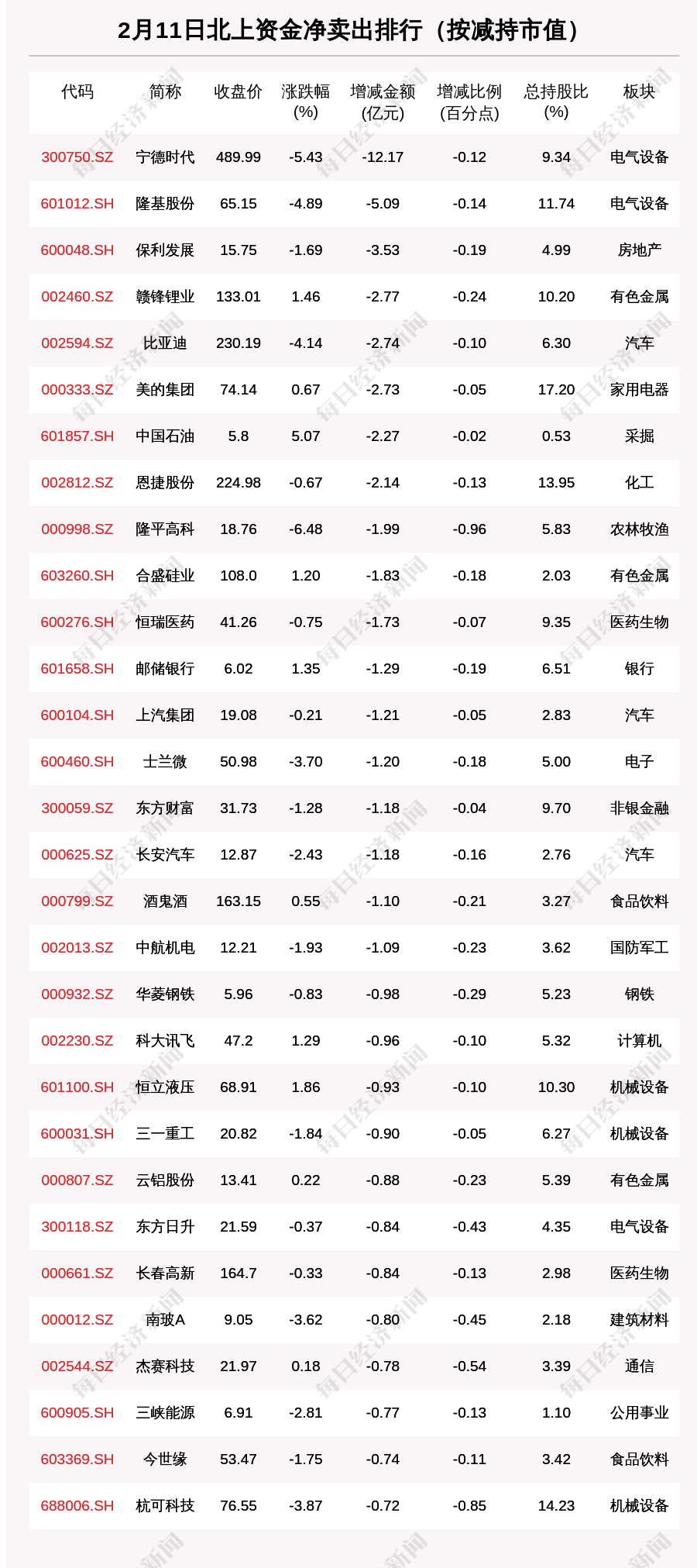2月11日,按照北向资金减持市值排序,宁德时代(300750.SZ,收盘价:489.99元)减持市值最大,减持市值12.169亿元,环比减少1.22%。其他北上资金减持市值较多的个股还包括隆基股份(601012.SH,收盘价:65.15元)、保利发展(600048.SH,收盘价:15.75元)、赣锋锂业(002460.SZ,收盘价:133.01元)。