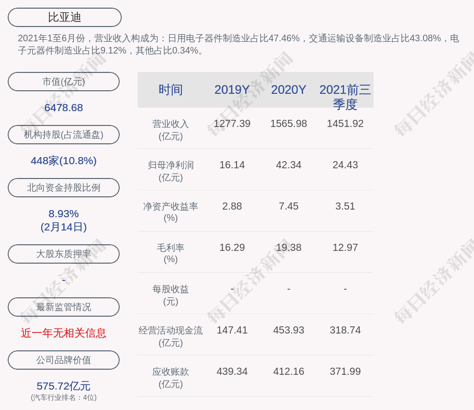 2021年1至6月份,比亚迪的营业收入构成为:日用电子器件制造业占比47.46%,交通运输设备制造业占比43.08%,电子元器件制造业占比9.12%,其他占比0.34%。