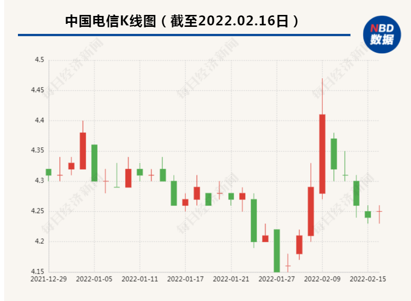 截至2月16日午间收盘,中国电信报4.25元/股,最新市值3889亿元。