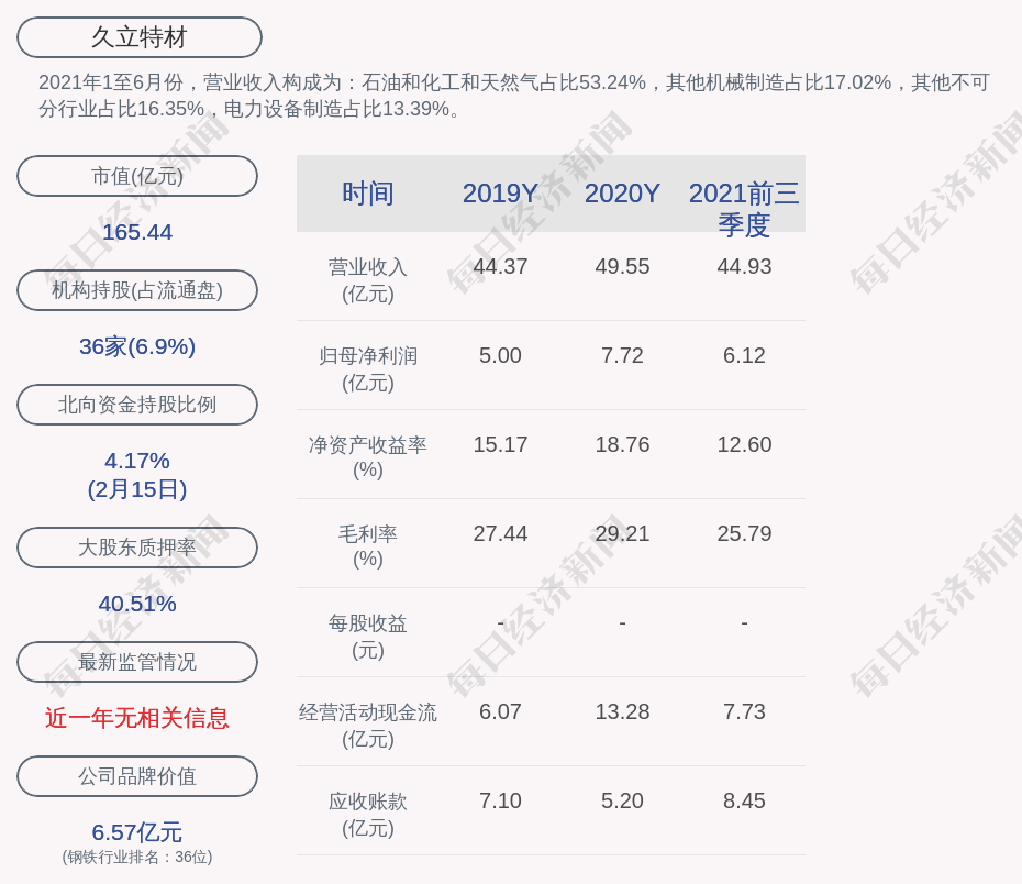 每经AI快讯,久立特材(SZ 002318,收盘价:16.93元)2月16日晚间发布公告称,截至本公告日,久立集团累计质押股数约为1.49亿股,占其所持股份比例为43.43%。