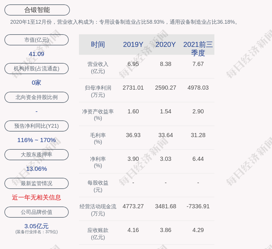 2020年1至12月份,合锻智能的营业收入构成为:专用设备制造业占比58.93%,通用设备制造业占比36.18%。