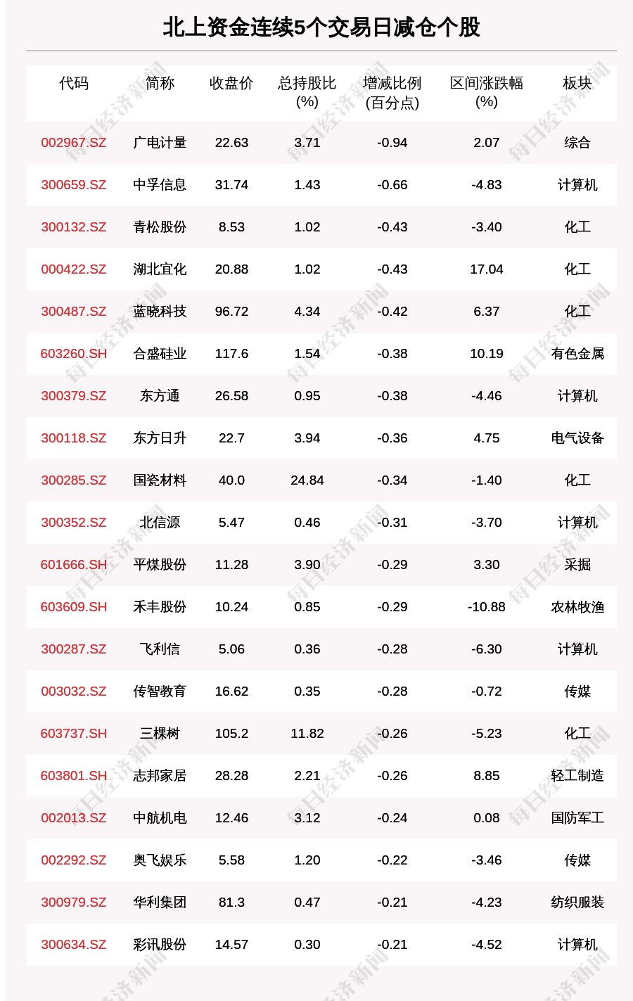 每经AI快讯,2月17日,北上资金连续5个交易日卖出64个股。北上资金连续5个交易日减仓个股中,广电计量(002967.SZ,收盘价:22.63元)减持比例增幅最大,5个交易日减持0.94百分点,其他跌幅较大的个股包括中孚信息(300659.SZ,收盘价:31.74元)、青松股份(300132.SZ,收盘价:8.53元)、湖北宜化(000422.SZ,收盘价:20.88元),分别减持0.66个百分点、0.43个百分点、0.43个百分点。
