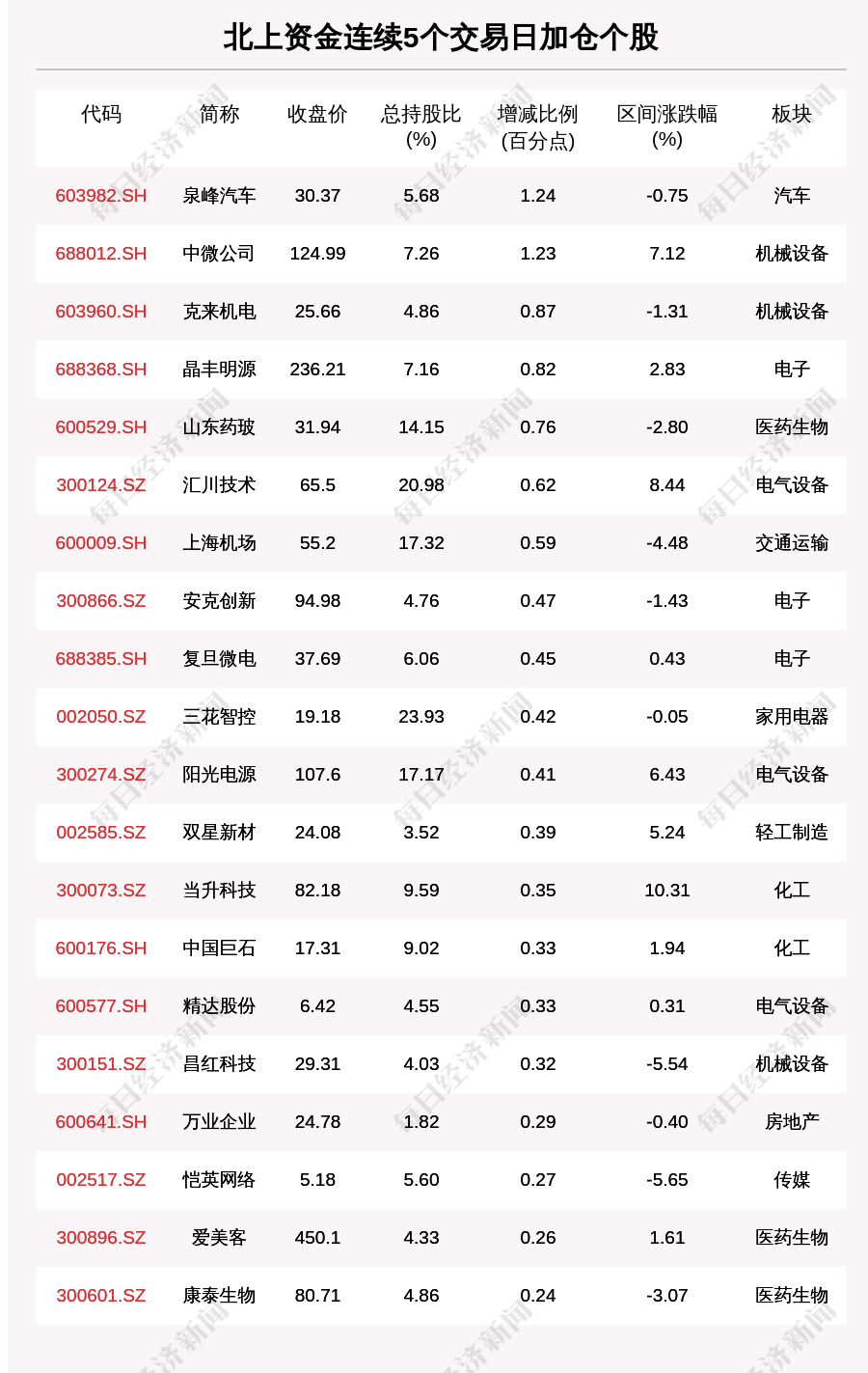 每经AI快讯,2月17日,北上资金连续5个交易日买入40个股。北上资金连续5个交易日加仓个股中,泉峰汽车(603982.SH,收盘价:30.37元)增持比例增幅最大,5个交易日增持1.24个百分点,其他增持比例较大的个股包括中微公司(688012.SH,收盘价:124.99元)、克来机电(603960.SH,收盘价:25.66元)、晶丰明源(688368.SH,收盘价:236.21元),分别增持1.23个百分点、0.87个百分点、0.82个百分点。