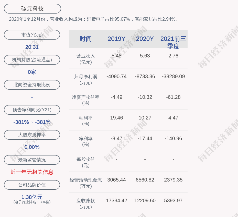 2020年1至12月份,碳元科技的营业收入构成为:消费电子占比95.67%,智能家居占比2.94%。
