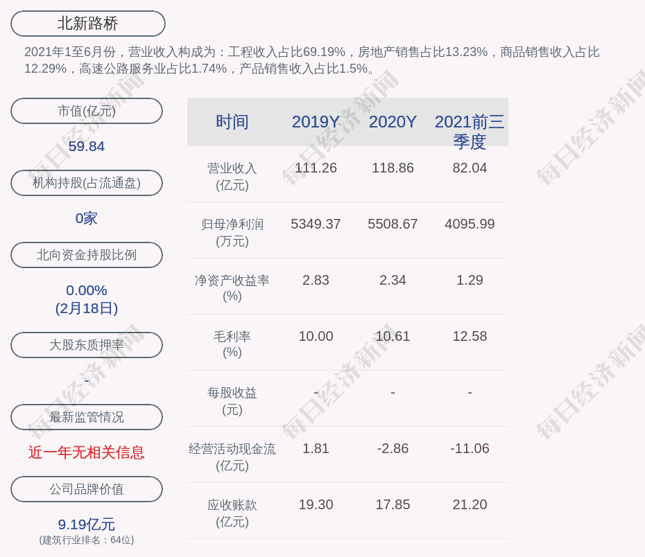 2021年1至6月份,北新路桥的营业收入构成为:工程收入占比69.19%,房地产销售占比13.23%,商品销售收入占比12.29%,高速公路服务业占比1.74%,产品销售收入占比1.5%。