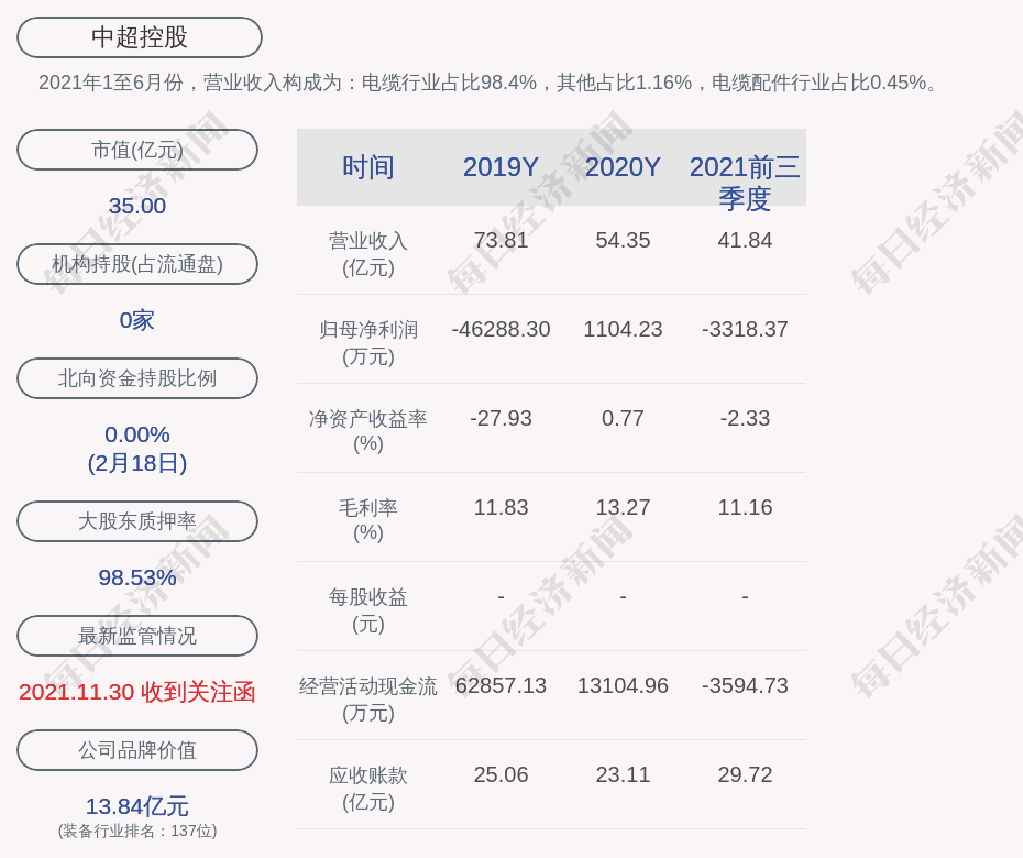 2021年1至6月份,中超控股的营业收入构成为:电缆行业占比98.4%,其他占比1.16%,电缆配件行业占比0.45%。