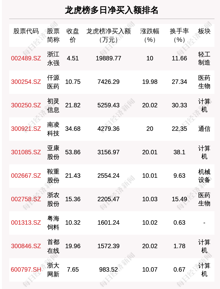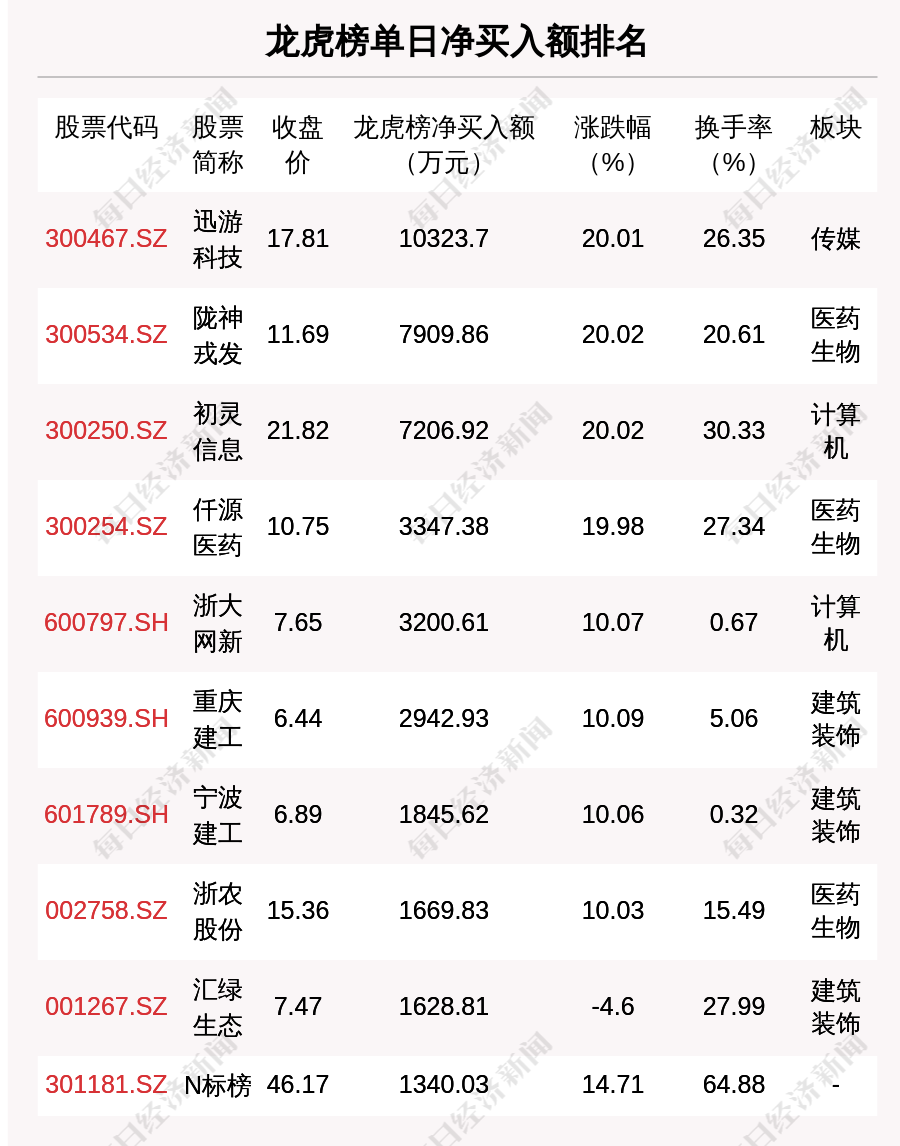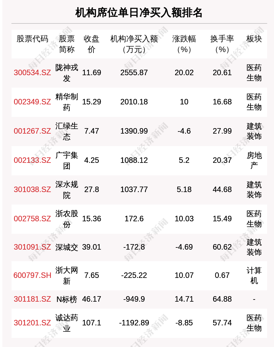 在龙虎榜中,涉及机构专用席位的个股有16只,净买入额前三的是陇神戎发、精华制药、汇绿生态,分别为2555.87万元、2010.18万元、1390.99万元。