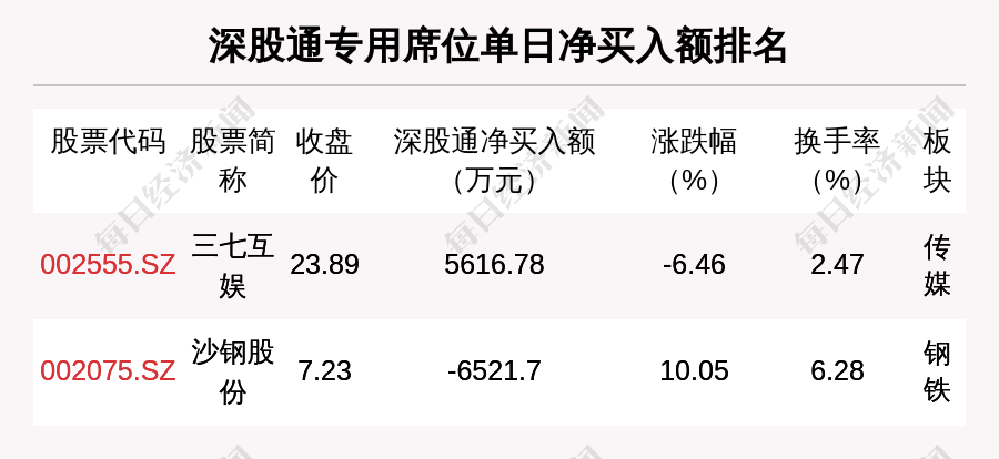 在龙虎榜中,涉及深股通专用席位的个股有2只,三七互娱的深股通专用席位净买入额最大,净买入5616.78万元。