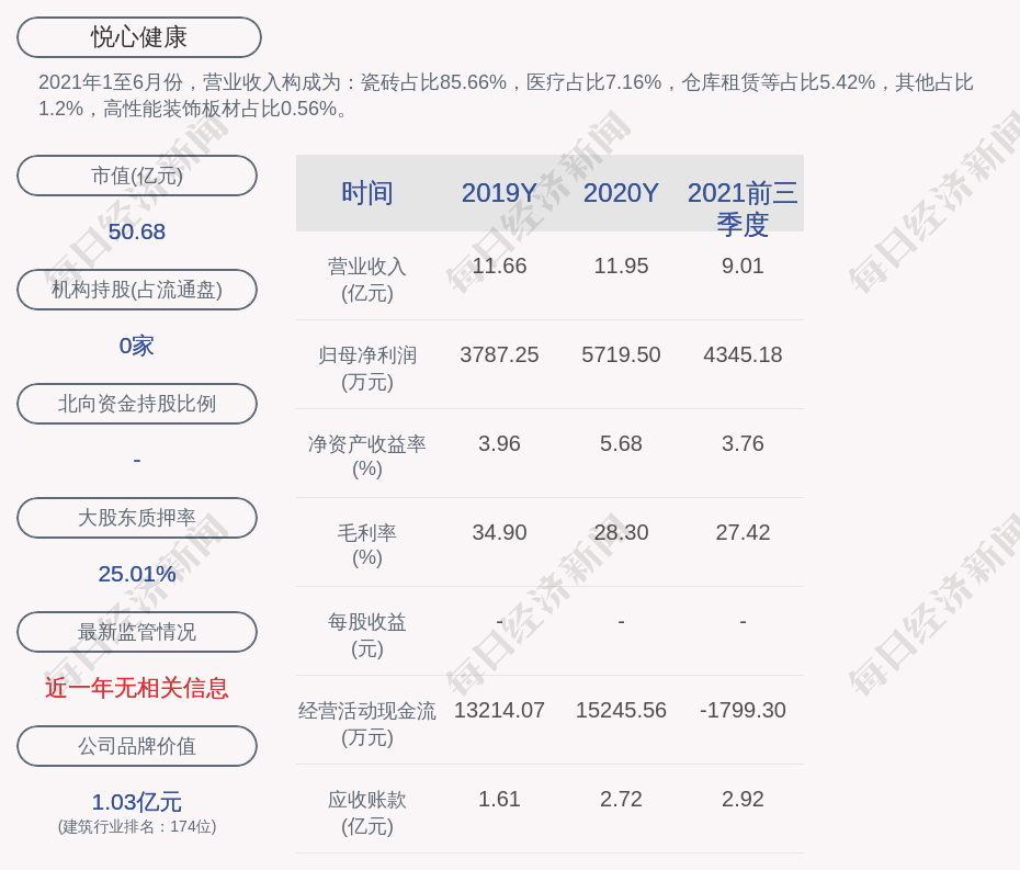 2021年1至6月份,悦心健康的营业收入构成为:瓷砖占比85.66%,医疗占比7.16%,仓库租赁等占比5.42%,其他占比1.2%,高性能装饰板材占比0.56%。