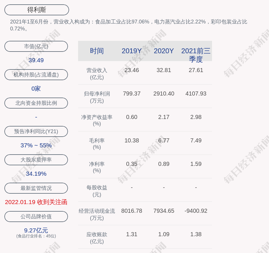 2021年1至6月份,得利斯的营业收入构成为:食品加工业占比97.06%,电力蒸汽业占比2.22%,彩印包装业占比0.72%。