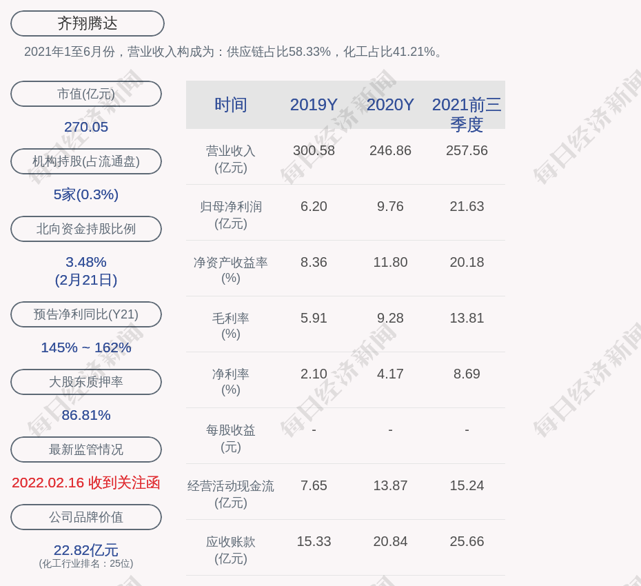 2021年1至6月份,齐翔腾达的营业收入构成为:供应链占比58.33%,化工占比41.21%。