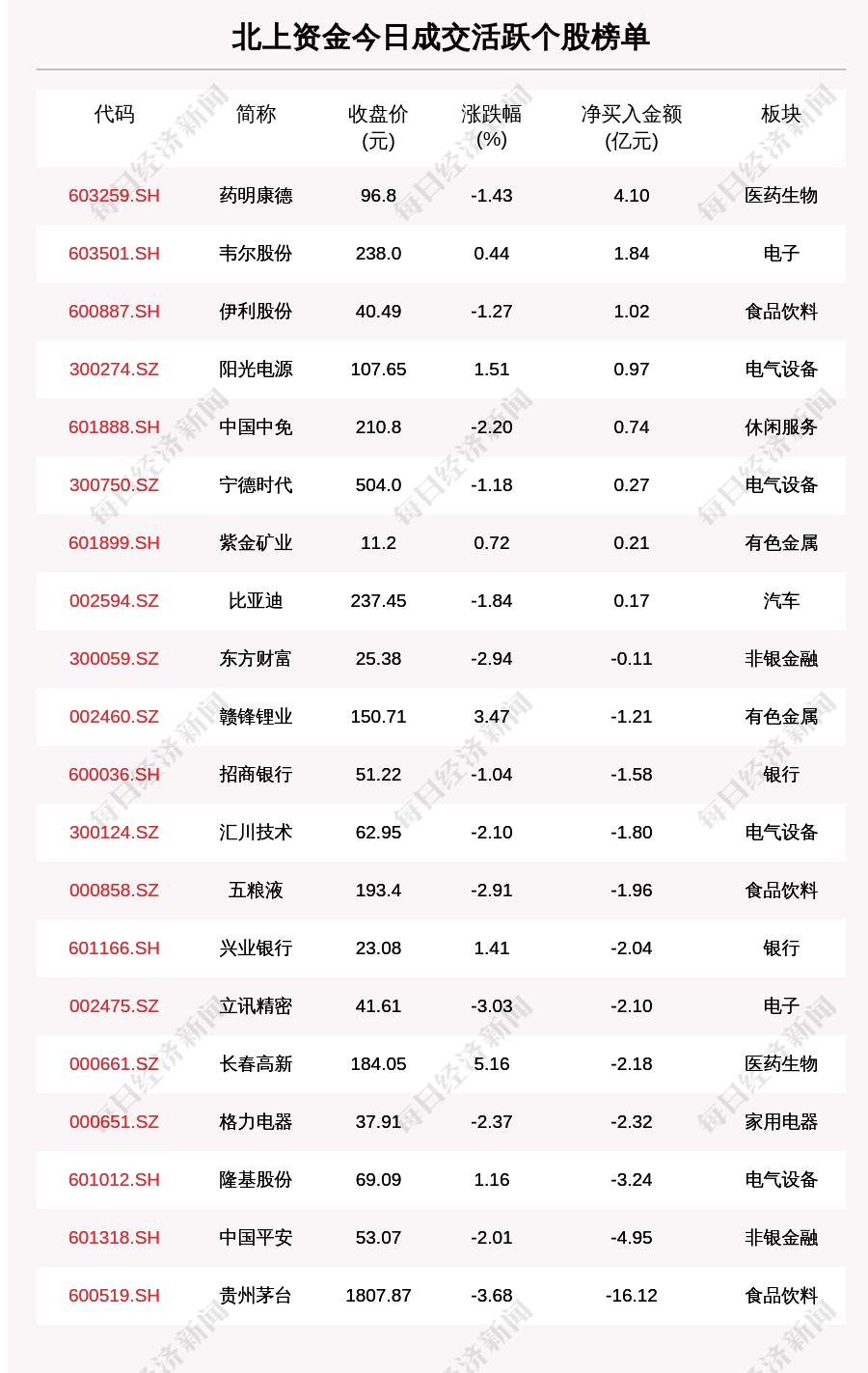 2月22日,北上资金成交活跃个股榜单中,净买入个股共8只,金额最多的是药明康德(603259.SH,收盘价:96.8元),净买入4.102亿元;净卖出个股共12只,金额最多的是贵州茅台(600519.SH,收盘价:1807.87元),净卖出16.124亿元。