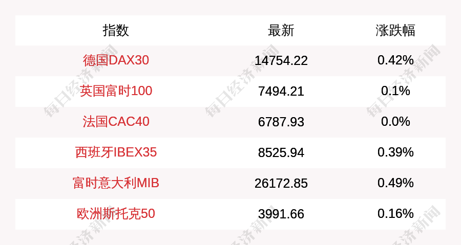 每经AI快讯:北京时间2月23日16:00,德国DAX30指数开盘上涨61.22点,涨幅为0.42%,报14754.22点;英国富时100指数开盘上涨7.65点,涨幅为0.1%,报7501.86点;法国CAC40指数平开,报6787.93点;西班牙IBEX35指数开盘上涨32.74点,涨幅为0.39%,报8525.94点;富时意大利MIB指数开盘上涨128.89点,涨幅为0.49%,报26172.85点;欧洲斯托克50指数开盘上涨6.19点,涨幅为0.16%,报3991.66点。