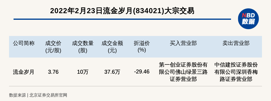 每经讯,2022年2月23日,北交所上市公司流金岁月(834021)发生一笔大宗交易,成交价3.76元/股,成交数量10万股,成交金额37.6万元,折价29.46%。买入营业部是第一创业证券股份有限公司佛山绿景三路证券营业部,卖出营业部是中信建投证券股份有限公司深圳香梅路证券营业部。