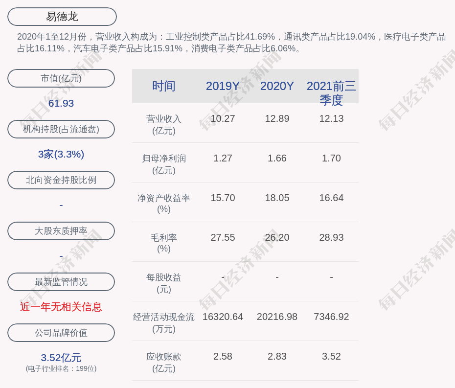 2020年1至12月份,易德龙的营业收入构成为:工业控制类产品占比41.69%,通讯类产品占比19.04%,医疗电子类产品占比16.11%,汽车电子类产品占比15.91%,消费电子类产品占比6.06%。