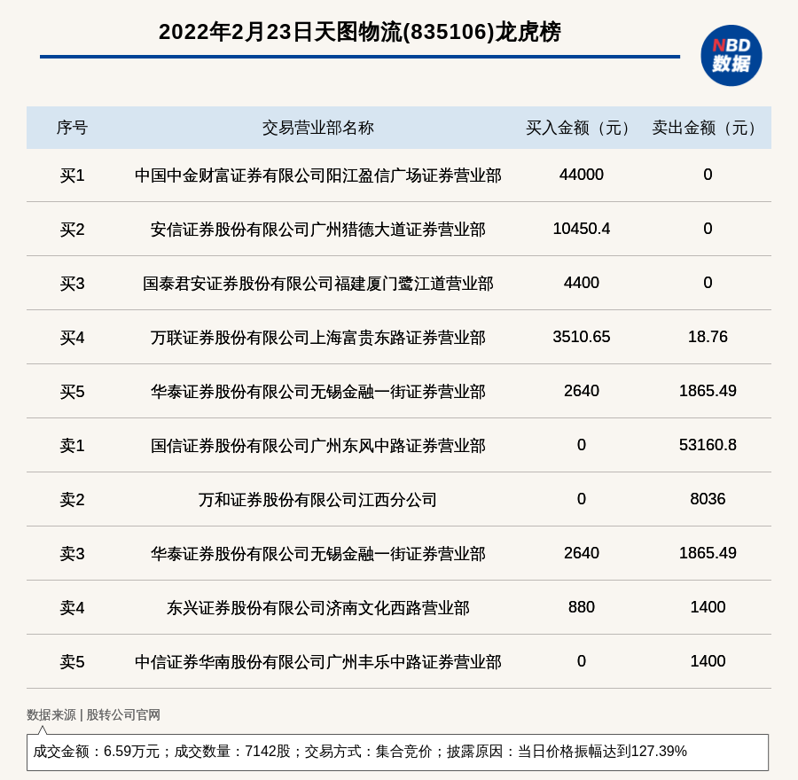 每经讯,2022年2月23日,新三板基础层公司天图物流(835106)登上龙虎榜,交易方式是集合竞价,披露原因是当日价格振幅达到127.39%,成交数量7142股,成交金额6.59万元。买一席位为中国中金财富证券有限公司阳江盈信广场证券营业部,买入4.4万元;卖一席位为国信证券股份有限公司广州东风中路证券营业部,卖出5.32万元。