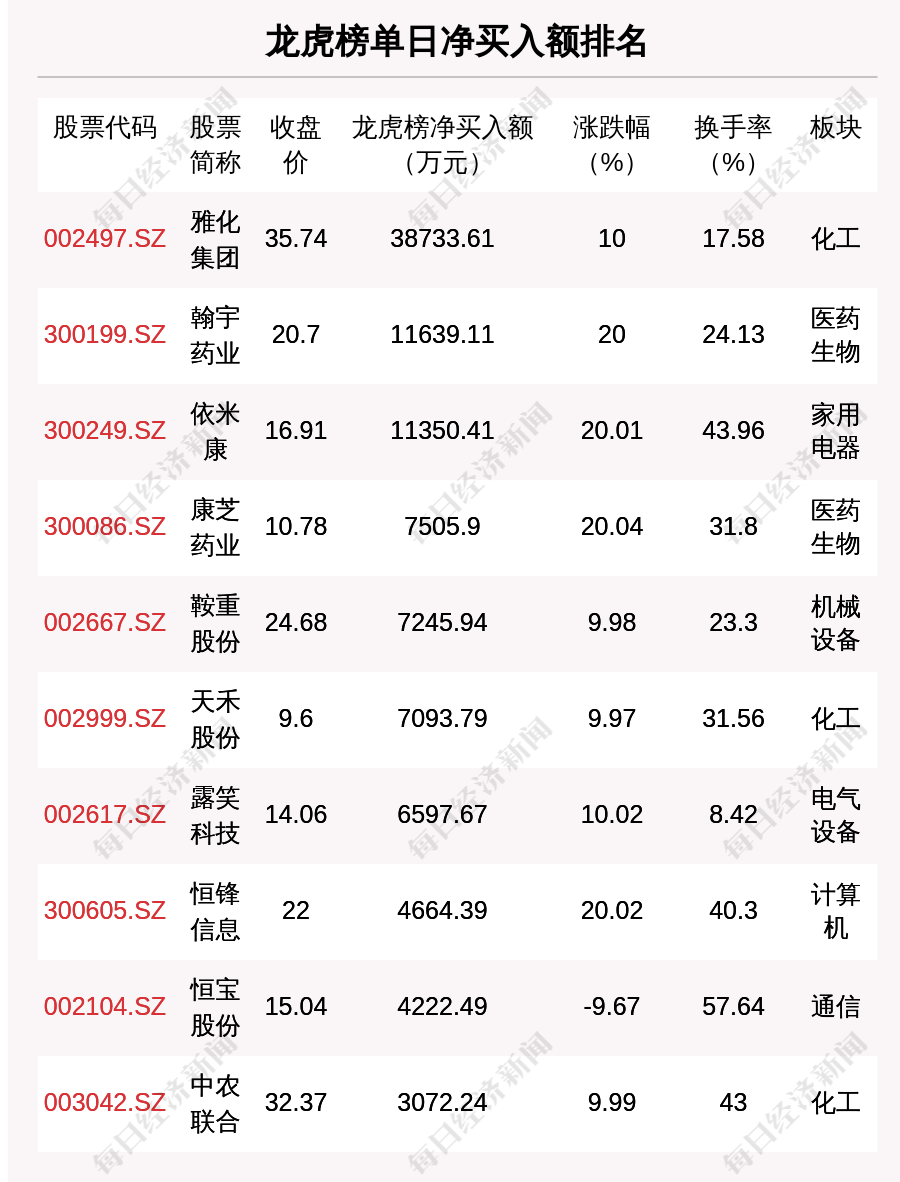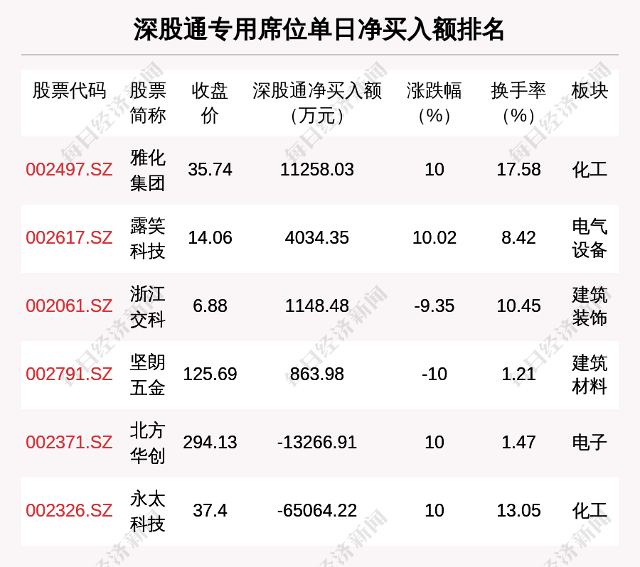 在龙虎榜中,涉及深股通专用席位的个股有6只,雅化集团的深股通专用席位净买入额最大,净买入1.13亿元。