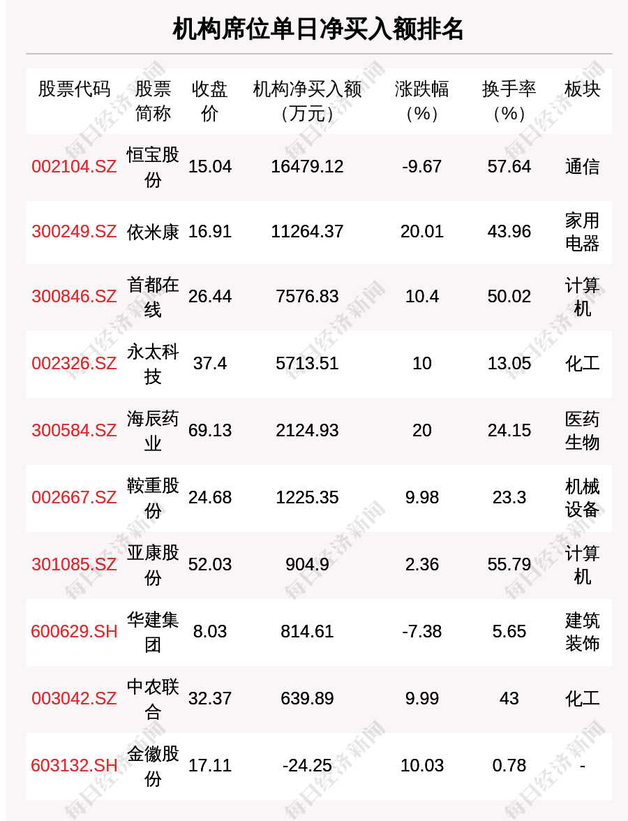 在龙虎榜中,涉及机构专用席位的个股有18只,净买入额前三的是恒宝股份、依米康、首都在线,分别为1.65亿元、1.13亿元、7576.83万元。