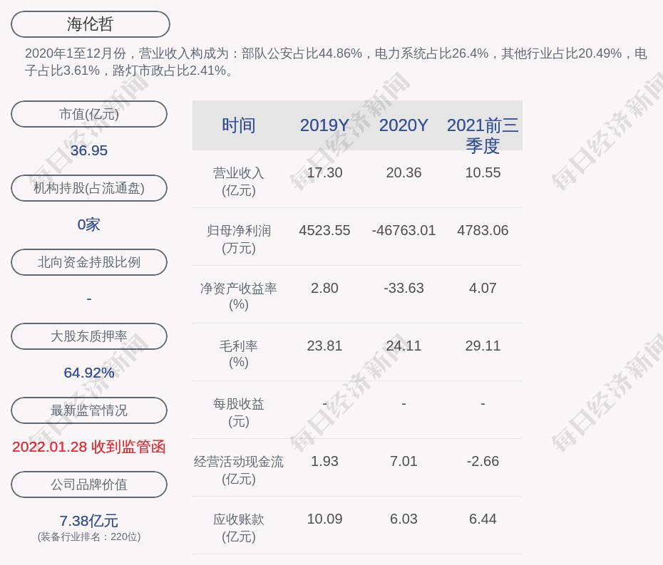 2020年1至12月份,海伦哲的营业收入构成为:部队公安占比44.86%,电力系统占比26.4%,其他行业占比20.49%,电子占比3.61%,路灯市政占比2.41%。