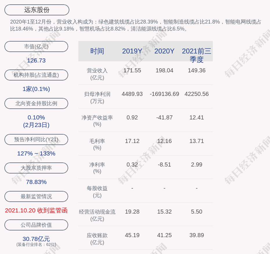 每经AI快讯,远东股份(SH 600869,收盘价:5.71元)2月24日晚间发布公告称,截至目前,公司对外担保总额为约85.4亿元,实际担保余额为约53.6亿元,分别占公司2020年经审计归属于上市公司股东的净资产的比例为268.44%、168.48%,其中:公司对全资/控股子公司的担保总额为约81.4亿元,实际担保余额为约50.14亿元,分别占公司2020年经审计归属于上市公司股东的净资产的255.87%、157.61%;公司对其他公司的担保总额为4亿元,实际担保余额为3.46亿元,分别占公司2020年经审计归属于上市公司股东的净资产的12.57%、10.88%,公司对外担保均不存在逾期情形。