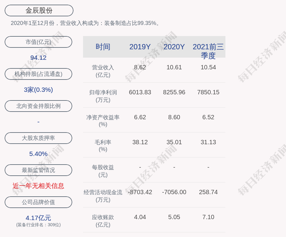 2020年1至12月份,金辰股份的营业收入构成为:装备制造占比99.35%。
