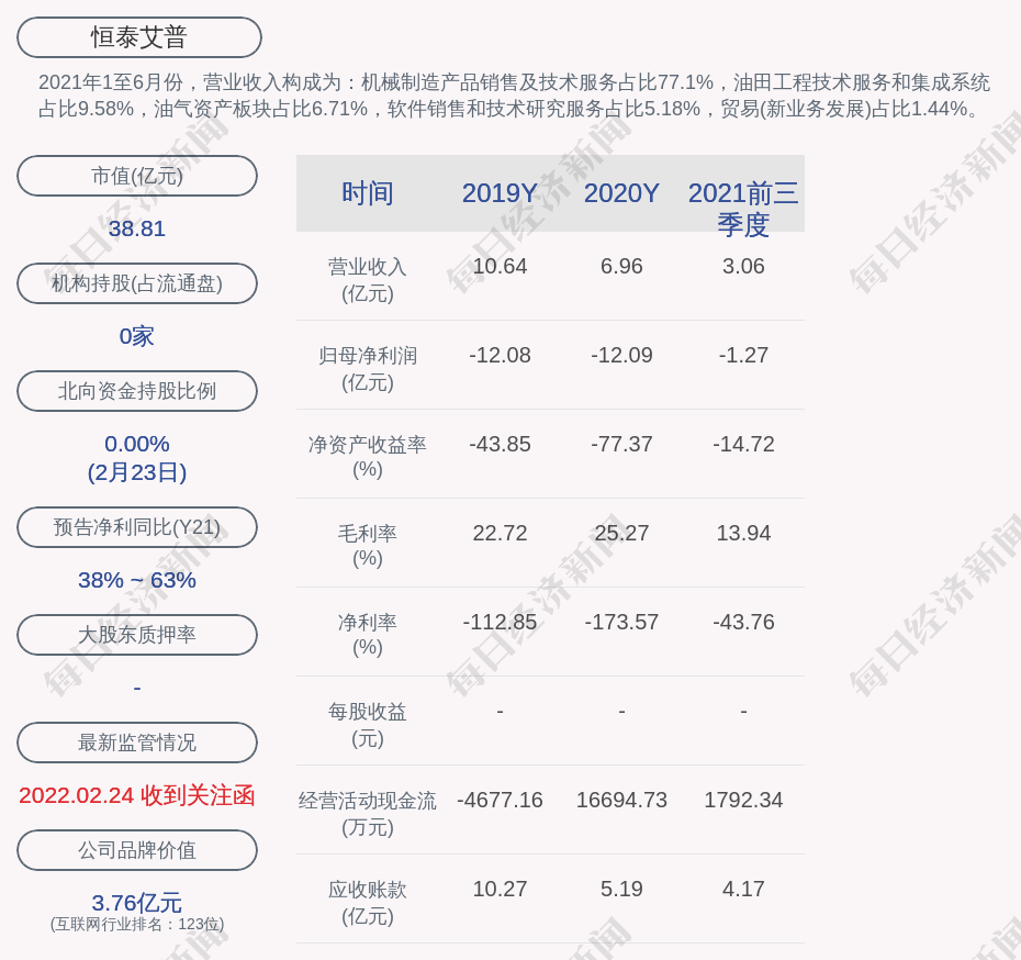 2021年1至6月份,恒泰艾普的营业收入构成为:机械制造产品销售及技术服务占比77.1%,油田工程技术服务和集成系统占比9.58%,油气资产板块占比6.71%,软件销售和技术研究服务占比5.18%,贸易(新业务发展)占比1.44%。