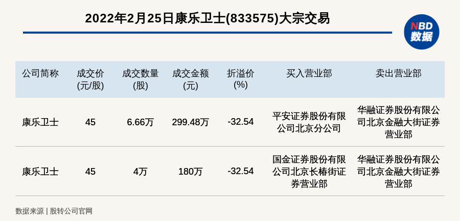 每经讯,2022年2月25日,新三板创新层公司康乐卫士(833575)发生2笔大宗交易,总成交金额为479.48万元,成交金额最高的一笔成交价45元/股,成交数量6.66万股,成交金额299.48万元,折价32.54%。买入营业部是平安证券股份有限公司北京分公司,卖出营业部是华融证券股份有限公司北京金融大街证券营业部。