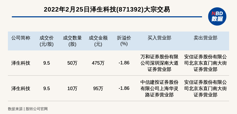 每经讯,2022年2月25日,新三板基础层公司泽生科技(871392)发生2笔大宗交易,总成交金额为570万元,成交金额最高的一笔成交价9.5元/股,成交数量50万股,成交金额475万元,折价1.86%。买入营业部是万和证券股份有限公司深圳深南大道证券营业部,卖出营业部是安信证券股份有限公司北京东直门南大街证券营业部。