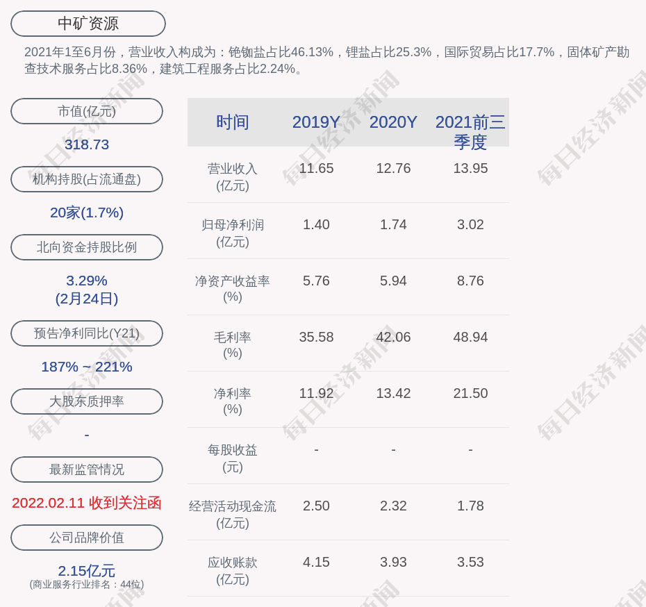 2021年1至6月份,中矿资源的营业收入构成为:铯铷盐占比46.13%,锂盐占比25.3%,国际贸易占比17.7%,固体矿产勘查技术服务占比8.36%,建筑工程服务占比2.24%。