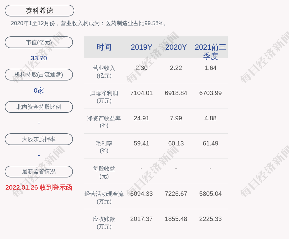 2020年1至12月份,赛科希德的营业收入构成为:医药制造业占比99.58%。