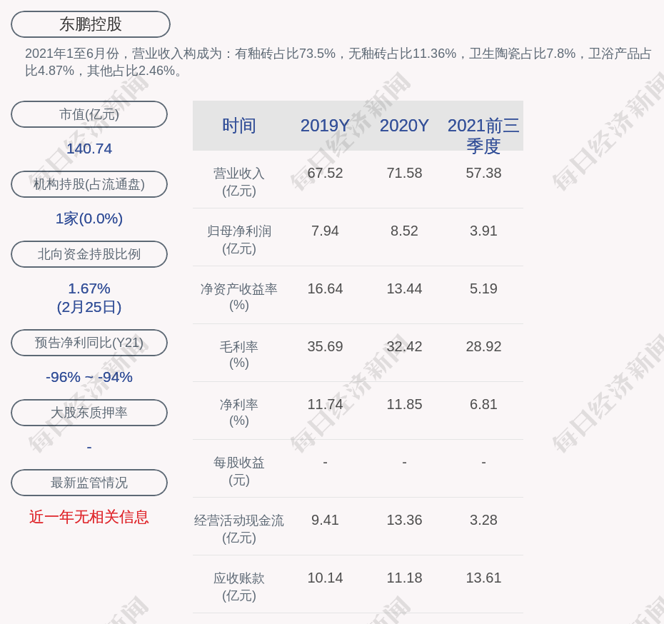 2021年1至6月份,东鹏控股的营业收入构成为:有釉砖占比73.5%,无釉砖占比11.36%,卫生陶瓷占比7.8%,卫浴产品占比4.87%,其他占比2.46%。