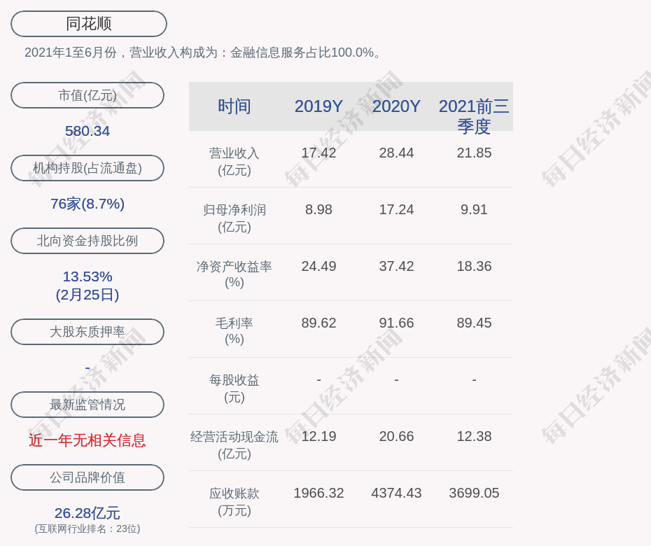 2021年1至6月份,同花顺的营业收入构成为:金融信息服务占比100.0%。