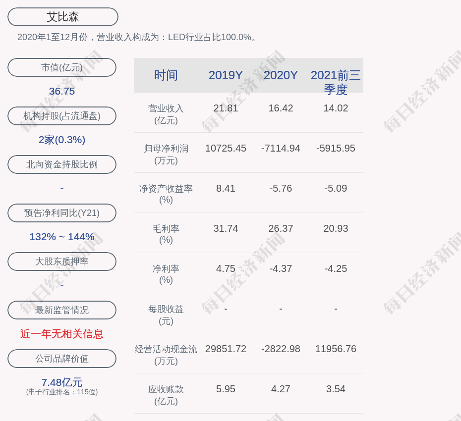 2020年1至12月份,艾比森的营业收入构成为:LED行业占比100.0%。