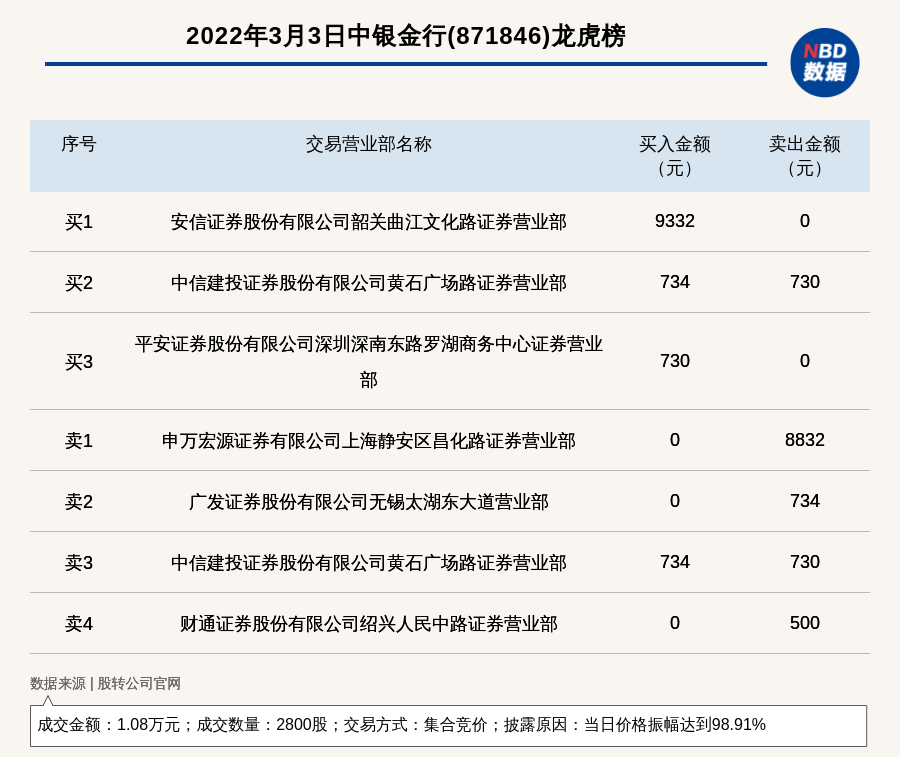 每经讯,2022年3月3日,新三板创新层公司中银金行(871846)登上龙虎榜,交易方式是集合竞价,披露原因是当日价格振幅达到98.91%,成交数量2800股,成交金额1.08万元。买一席位为安信证券股份有限公司韶关曲江文化路证券营业部,买入9332元;卖一席位为申万宏源证券有限公司上海静安区昌化路证券营业部,卖出8832元。