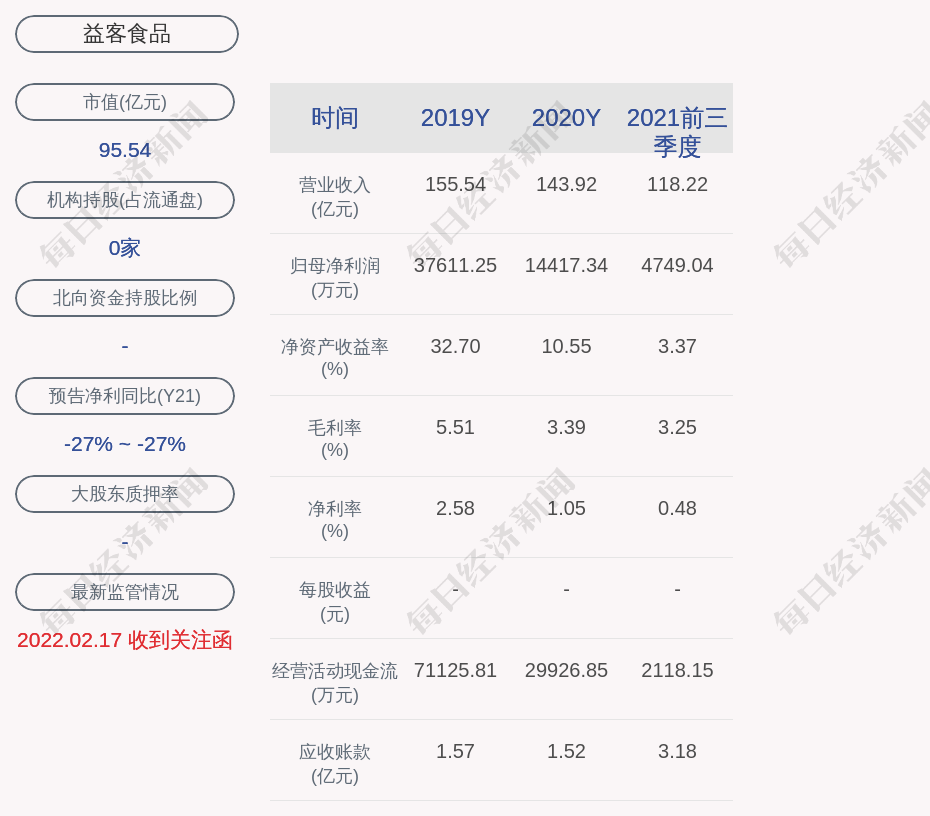 每经AI快讯,益客食品(SZ 301116,最新价:21.28元)3月8日午间发布公告称,截至本公告日,公司及控股子公司对外担保总额约为20.08亿元,占公司最近一期经审计净资产(截至2021年6月30日,净资产约为14.64亿元)的137.12%,公司及控股子公司为公司外主体提供的担保余额约为2亿元,占公司最近一期经审计净资产的比例为13.65%。