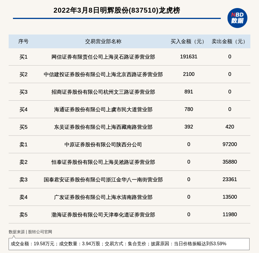 每经讯,2022年3月8日,新三板创新层公司明辉股份(837510)登上龙虎榜,交易方式是集合竞价,披露原因是当日价格振幅达到53.59%,成交数量3.94万股,成交金额19.58万元。买一席位为网信证券有限责任公司上海灵石路证券营业部,买入19.16万元;卖一席位为中原证券股份有限公司陕西分公司,卖出9.72万元。
