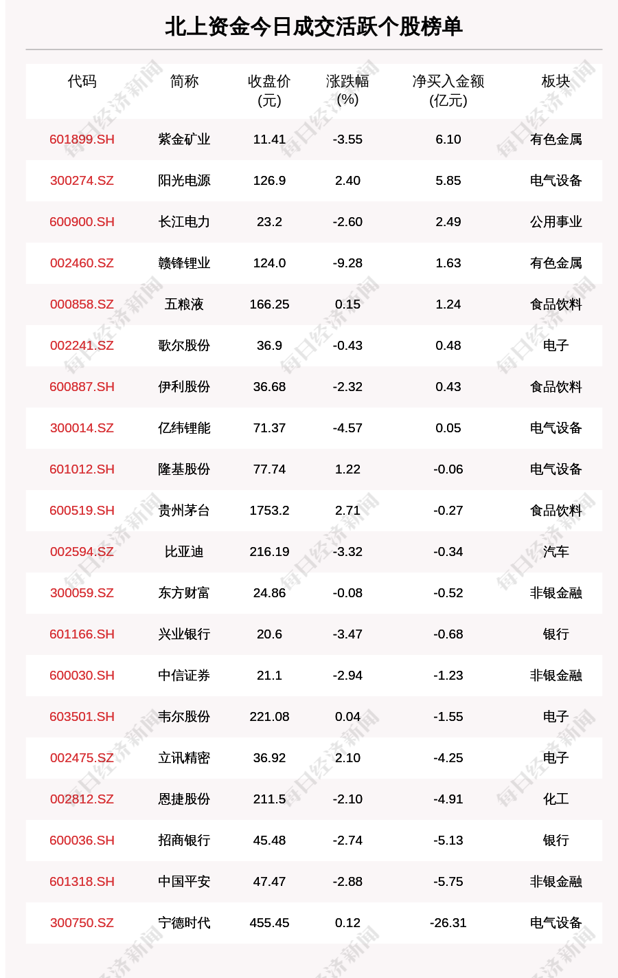 3月8日,北上资金成交活跃个股榜单中,净买入个股共8只,金额最多的是紫金矿业(601899.SH,收盘价:11.41元),净买入6.104亿元;净卖出个股共12只,金额最多的是宁德时代(300750.SZ,收盘价:455.45元),净卖出26.314亿元。