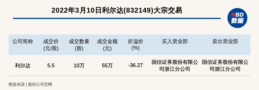 每经讯,2022年3月10日,新三板创新层公司利尔达(832149)发生一笔大宗交易,成交价5.5元/股,成交数量10万股,成交金额55万元,折价36.27%。买入营业部是国信证券股份有限公司浙江分公司,卖出营业部是国信证券股份有限公司浙江分公司。