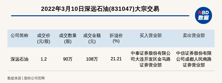 每经讯,2022年3月10日,新三板基础层公司深远石油(831047)发生一笔大宗交易,成交价1.2元/股,成交数量90万股,成交金额108万元,溢价21.21%。买入营业部是中泰证券股份有限公司大连开发区金马路证券营业部,卖出营业部是中信证券股份有限公司成都人民南路证券营业部。
