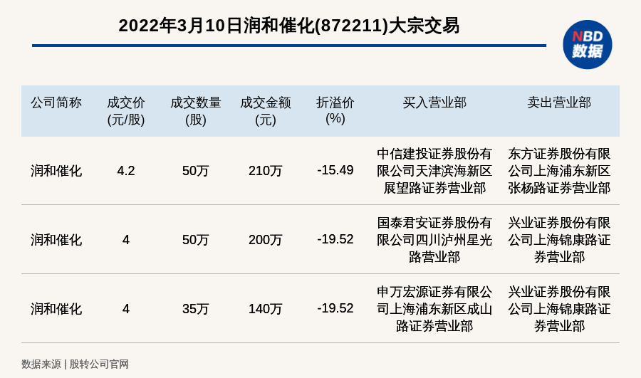 每经讯,2022年3月10日,新三板基础层公司润和催化(872211)发生3笔大宗交易,总成交金额为550万元,成交金额最高的一笔成交价4.2元/股,成交数量50万股,成交金额210万元,折价15.49%。买入营业部是中信建投证券股份有限公司天津滨海新区展望路证券营业部,卖出营业部是东方证券股份有限公司上海浦东新区张杨路证券营业部。