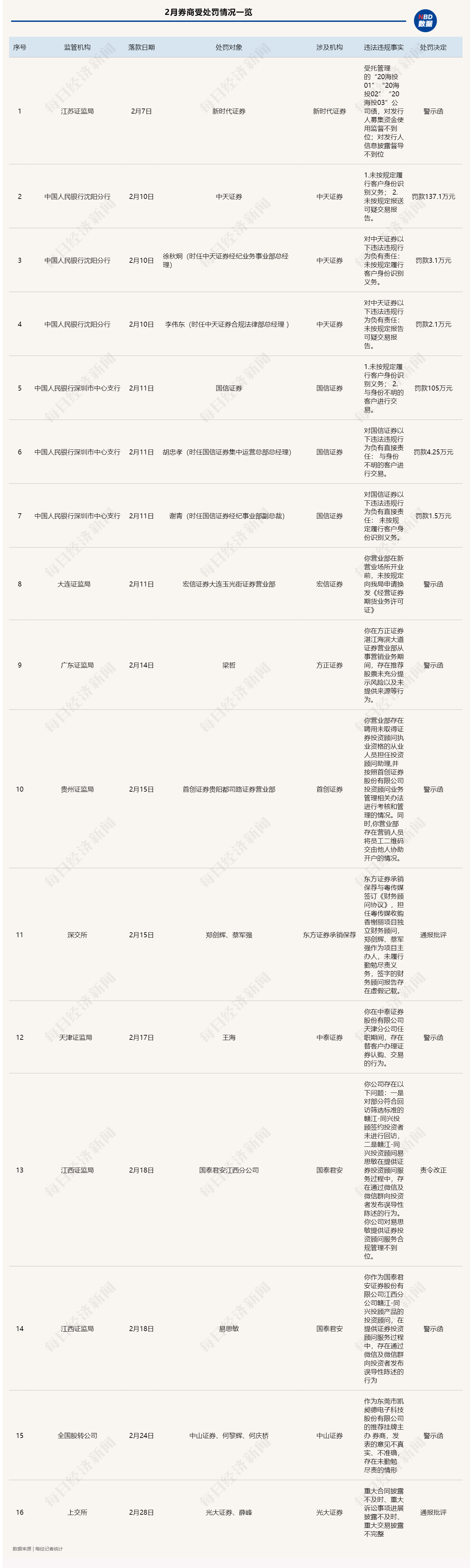 ◎《每日经济新闻》记者统计显示,以落款日期计算,2022年2月,监管机构对证券行业共计开出了16张罚单,涉及11家券商,中天证券和国信证券各领到3张,皆因反洗钱工作不到位而受到处罚;其次是国泰君安,因分公司违规,涉及2张罚单。